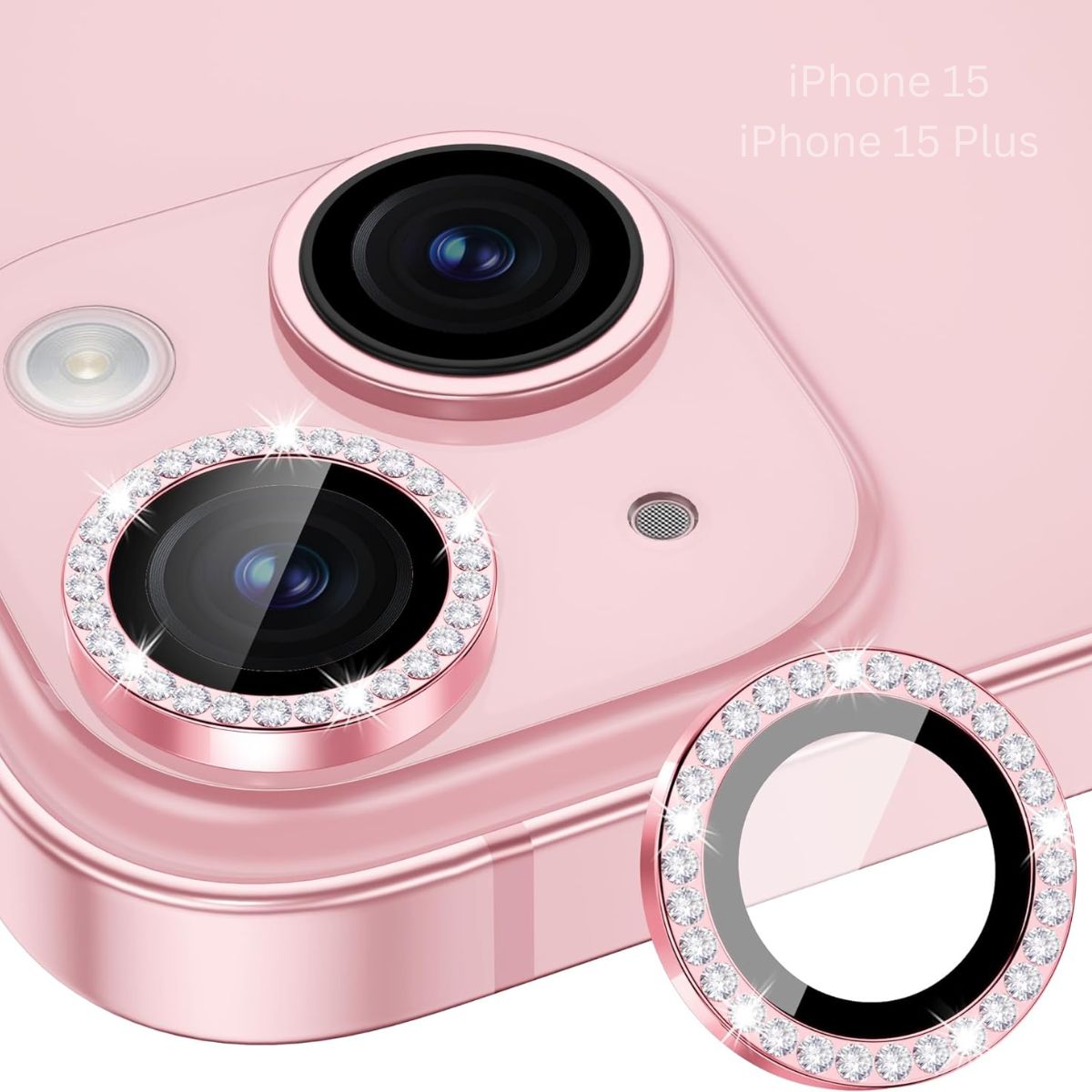 Introducing our iPhone 15 Camera Lens Protectors in pink color, designed with stunning diamonds for a glitter sparkle effect. Made to safeguard the brilliance of your iPhone 15 back camera lens. Compatible with iPhone 15 & iPhone 15 Plus. Especially designed for the pink iPhone 15 for women and girls.